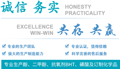 專業(yè)生產對,苯磺酸,苯酚磺酸等磺酸類產品及抗氧劑的生產:如抗氧劑300,抗氧劑BHT等;酚類產品有間苯二酚、鄰甲酚及間甲酚等